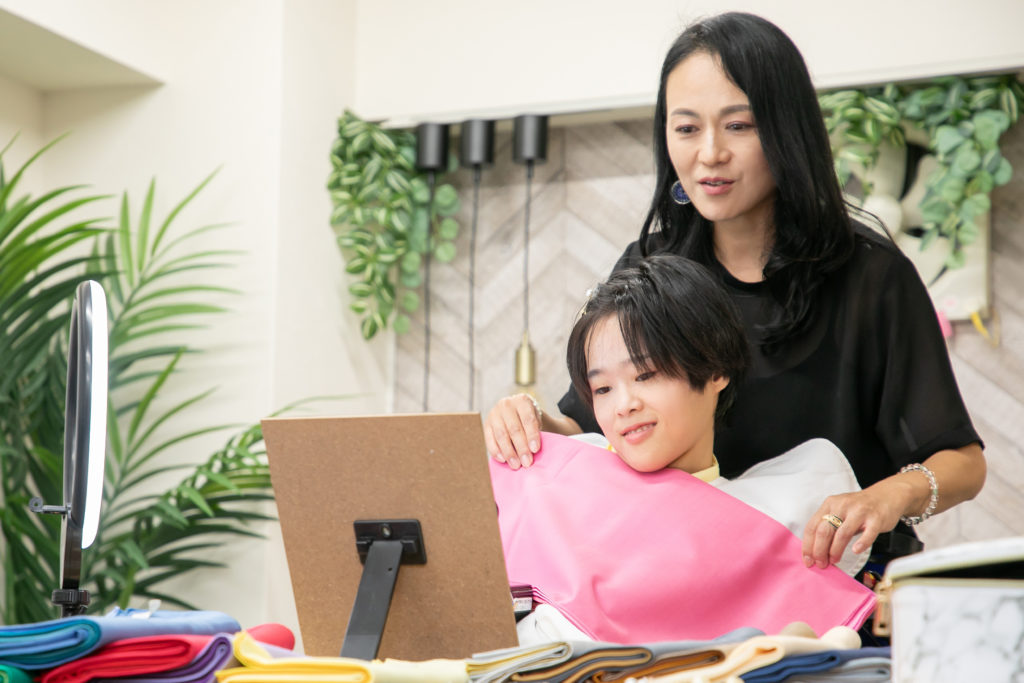 麗実さんに似合う色は「Summer」。ブルーベースで明るめの色が映えます。自分に合う色の布を当ててもらうと、笑みがこぼれる麗実さん。「くすみピンクが似合う」と聞くと、同行したお母さんに「メモしておいて!」と頼むほど、終始熱心に向き合っていました。