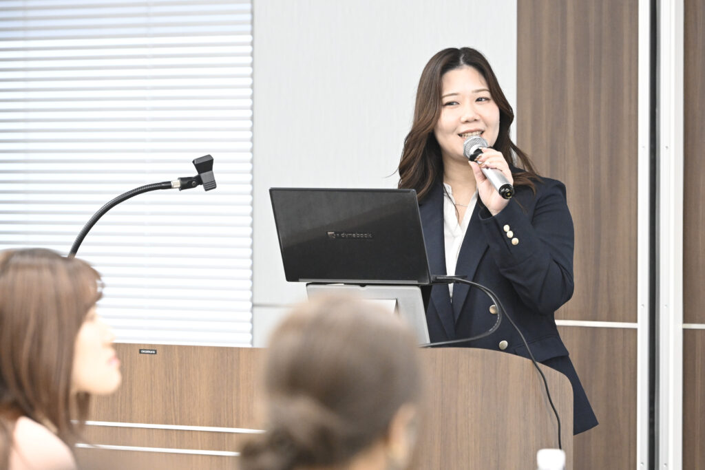 グループごとに座って和やかな雰囲気に包まれる中、冒頭では広報部で薬剤師の上吉川奈央さんが挨拶し「当社の調査によると、治療中に肌ケアを行い効果を感じた方の8割が、気持ちが前向きになるなどポジティブな心境の変化が起こることが分かりました」と話しました。