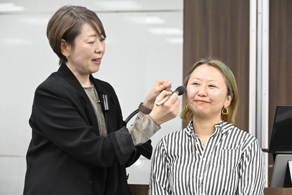 参加者は鏡を片手に、普段使いできる肌ケアメイクの工程を真剣にメモをしていました。